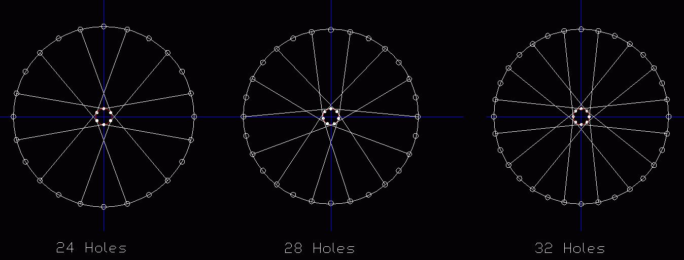 Lacing: correct lacing patterns with straight-pull spokes must be tangential, as shown below (and not as the traditional 2 or 3 crossings used for elbow spokes)